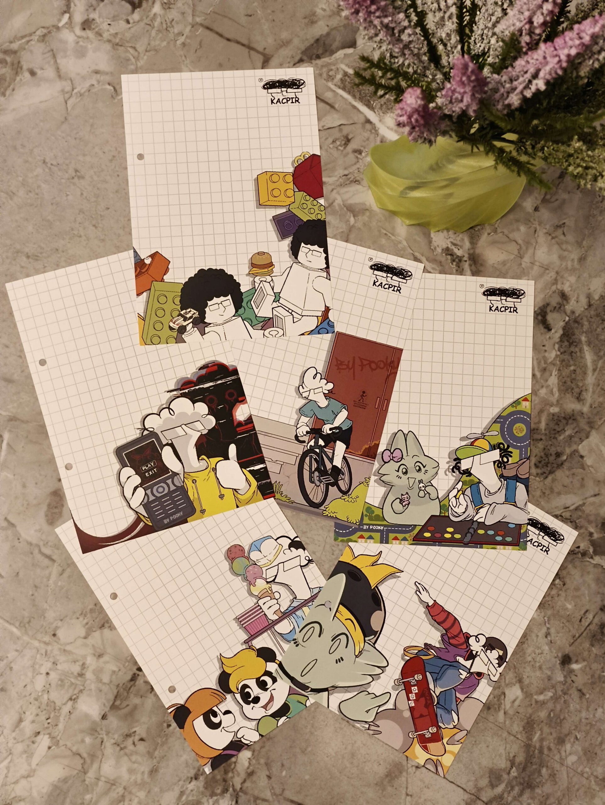 Zestaw 6 ilustrowanych karteczek w formacie A5, inspirowanych motywami z kanału Kacpira. Każda karteczka została zaprojektowana z myślą o kolekcjonowaniu – pasuje do standardowych segregatorów, ale sprawdzi się też jako ozdoba biurka, ściany lub notatnika.